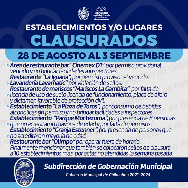 - Se clausuró el establecimiento «La Plaza de Toros» en la colonia Mirador por servir bebidas alcohólicas sin permiso y no colaborar con los inspectores.