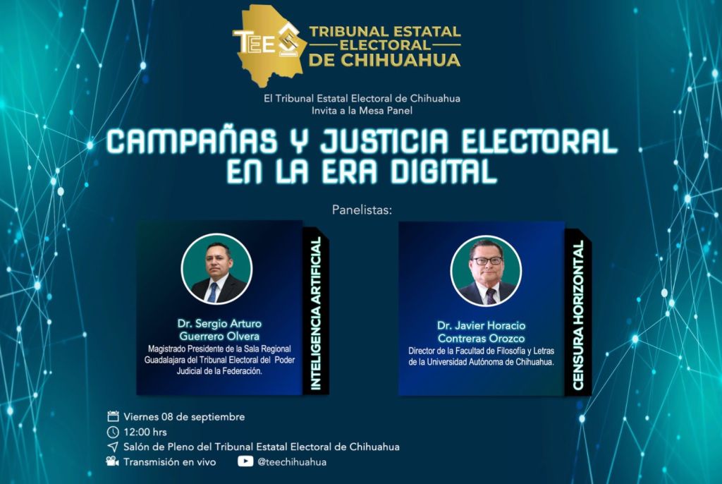 El Tribunal Estatal Electoral (TEE) llevará a cabo un ciclo de conferencias sobre Inteligencia Artificial y Justicia Digital. La primera actividad será una mesa panel titulada «Campañas y justicia electoral en la era digital», que contará con la participación del Doctor Sergio Arturo Guerrero Olvera, magistrado presidente de la Sala Regional Guadalajara del Tribunal Electoral del Poder Judicial de la Federación (TEPJF), y el Doctor Javier Horacio Contreras Orozco, director de la Facultad de Filosofía y Letras de la Universidad Autónoma de Chihuahua.