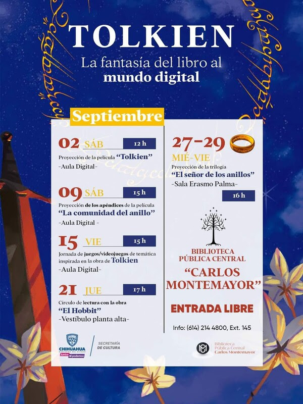 La Secretaría de Cultura está organizando una serie de eventos para conmemorar el 50 aniversario de la muerte de J.R.R. Tolkien. En colaboración con la Sociedad Tolkiendili de México A.C. y la organización Smial de Aglarond, se llevarán a cabo las jornadas «Tolkien: La fantasía del libro al mundo digital» en la Biblioteca Pública Central «Carlos Montemayor» del 2 al 29 de septiembre.