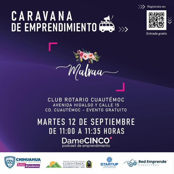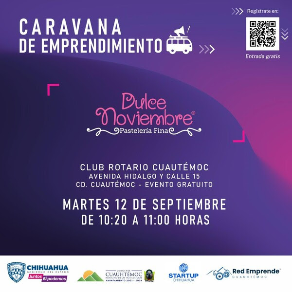 La Secretaría de Innovación y Desarrollo Económico (SIDE), en colaboración con el Gobierno Municipal de Cuauhtémoc, está invitando a emprendedores y empresarios a participar en la Caravana del Emprendimiento que se llevará a cabo el 12 de septiembre en el Club Rotario Cuauhtémoc, de 9:30 a 13:00 horas.
