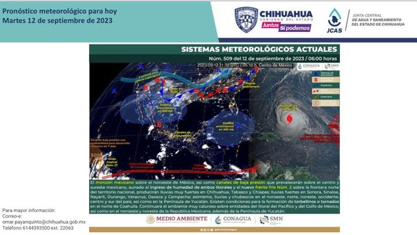 La dependencia mencionó que en la zona este, incluyendo lugares como El Oasis y Manuel Benavides, se esperan lluvias fuertes de 25.1 a 50 mm. En otras regiones como el norte, oeste, suroeste, centro, sureste y noreste, que incluyen ciudades como Juárez, Guadalupe, Ahumada, Palomas, Ocampo, Guerrero, Guachochi, Nonoava, Morelos, Guadalupe y Calvo, San Francisco de Borja, Cuauhtémoc, Chihuahua, Satevó, Julimes, Saucillo, La Cruz, Coyame y Ojinaga, se esperan lluvias dispersas a moderadas con chubascos de 5.1 a 25 mm.
