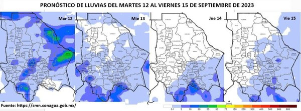 En algunas partes de la zona sureste, que incluye a Parral, Allende y Jiménez, se prevén lluvias aisladas de 0.1 a 2 mm, y es posible que vengan acompañadas de actividad eléctrica y granizo.