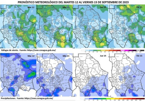 En las zonas noroeste, oeste, suroeste, centro y sureste, como Janos, Ascensión, Casas Grandes, Nuevo Casas Grandes, Ignacio Zaragoza, Gómez Farías, Madera, Namiquipa, Temósachic, Moris, Uruachi, Maguarichi, Chínipas, Guazapares, Urique, Batopilas, Balleza, Rosario, Rosales, Aldama, Delicias y Camargo, se esperan lluvias dispersas de 2.1 a 5 mm.