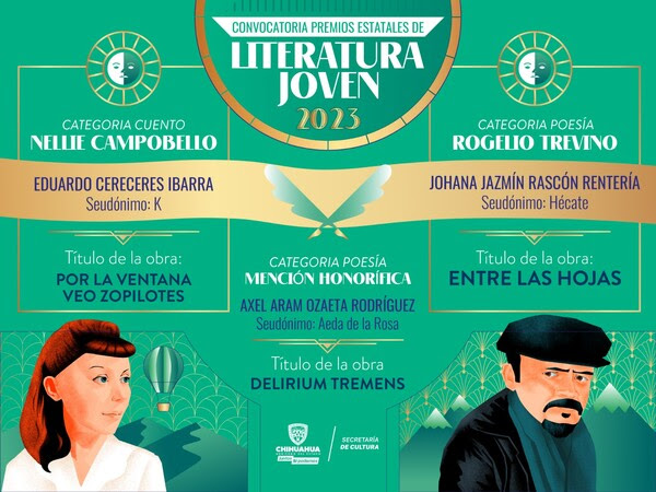 Eduardo Cereceres, quien está en el octavo semestre de la licenciatura de Letras Españolas en la Universidad Autónoma de Chihuahua (UACH), recibió el premio por su obra titulada «Por la ventana veo zopilotes». Por otro lado, Johana Rascón, licenciada en Letras Españolas por la UACH, ganó en la categoría de poesía con su obra «Entre las hojas». Johana Rascón también es conocida por su poemario «Migraciones» y ha recibido menciones honoríficas en otros concursos de poesía.