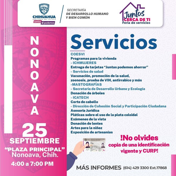 Es importante destacar que todos los servicios en «Juntos Cerca de Ti» son gratuitos, y se invita a los habitantes de Nonoava a aprovecharlos el lunes 25 de septiembre en la plaza principal del municipio, a partir de las 16:00 horas.