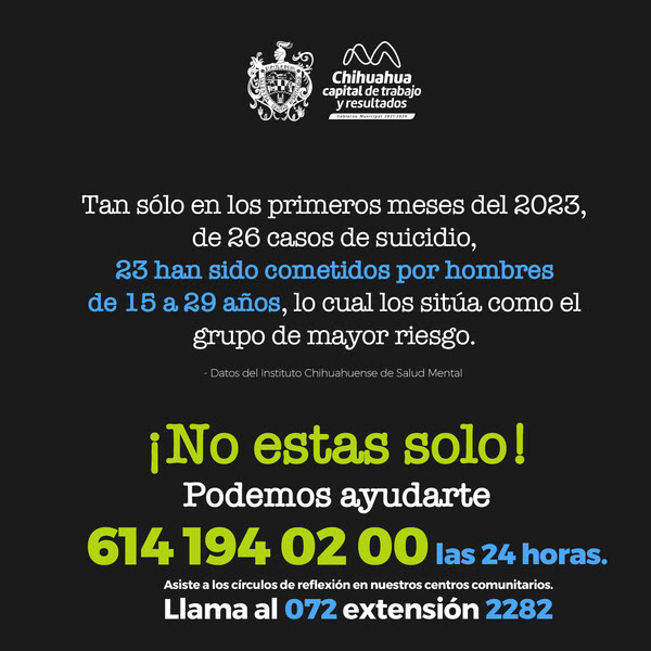 Según datos del Instituto Chihuahuense de Salud Mental, en el estado de Chihuahua, desde 2021 hasta la fecha, 91 menores de edad se han quitado la vida. En Chihuahua Capital, durante los primeros meses de 2023, se han registrado 26 casos de suicidio, de los cuales 23 han sido cometidos por hombres. Por esta razón, el Gobierno Municipal está trabajando en programas de prevención a través del DIF y el IMPAS.