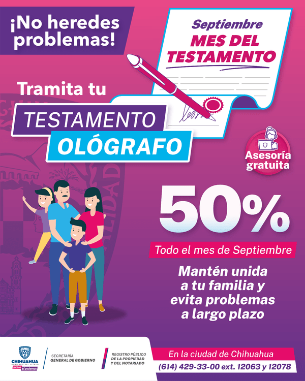 La Secretaría General de Gobierno, a través del Registro Público de la Propiedad, invita a los residentes de Chihuahua a aprovechar los últimos días del Mes del Testamento. Durante septiembre, se han tramitado un total de 931 testamentos ológrafos en diferentes oficinas del estado. Es esencial destacar que este proceso no está limitado únicamente a personas de la tercera edad; cualquier adulto puede hacerlo.