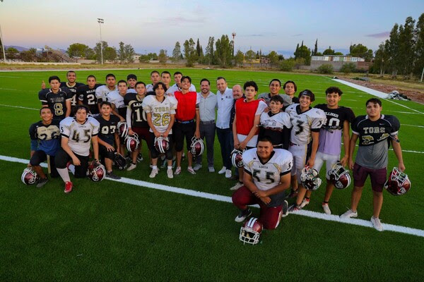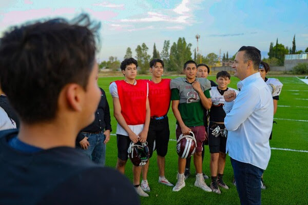 El Alcalde Marco Bonilla Mendoza realizó una visita de inspección a la cancha de fútbol americano del CBTIS número 122. El Gobierno Municipal está invirtiendo más de 4 millones de pesos en la instalación de césped artificial y un sistema de drenaje pluvial. Estas mejoras beneficiarán a los estudiantes que practican este deporte y representan a Chihuahua Capital en competencias locales y nacionales.