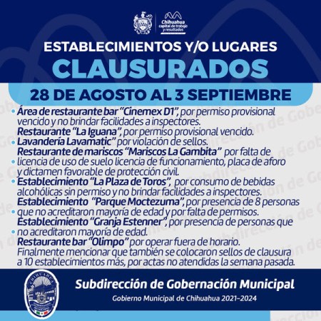 Durante el período del 28 de agosto al 03 de septiembre, la Gobernación Municipal ha cerrado un total de ocho negocios