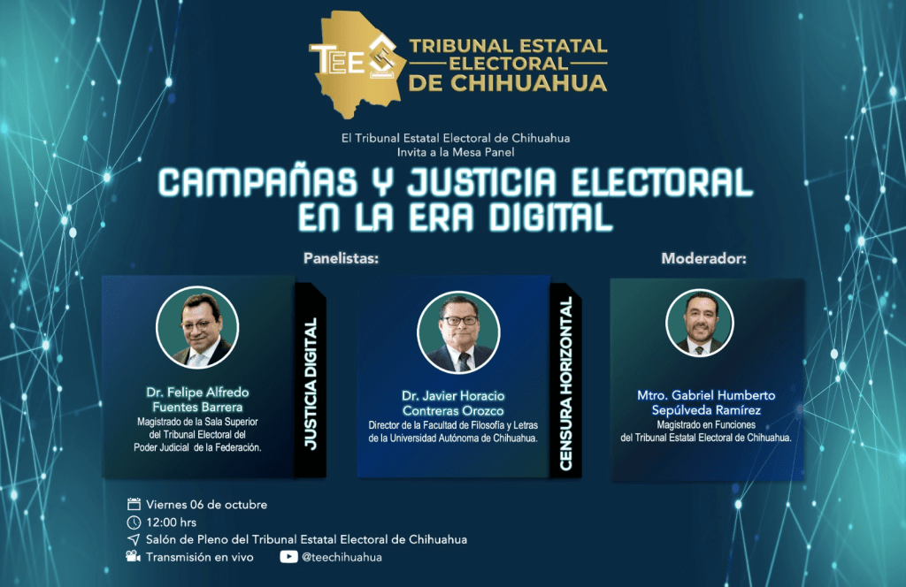 El Tribunal Estatal Electoral (TEE) llevará a cabo una mesa panel titulada «Campañas y justicia electoral en la era digital» el viernes 6 de octubre a las 12:00 horas en el Salón de Pleno del TEE. En esta mesa, el Dr. Felipe Alfredo Fuentes Barrera, Magistrado de la Sala Superior del Tribunal Electoral del Poder Judicial de la Federación (TEPJF), hablará sobre temas relacionados con la inteligencia artificial, mientras que el Dr. Javier Horacio Contreras Orozco, Director de la Facultad de Filosofía y Letras de la Universidad Autónoma de Chihuahua, se centrará en la censura en línea. La mesa será moderada por el Magistrado en Funciones, Gabriel Humberto Sepúlveda Ramírez.