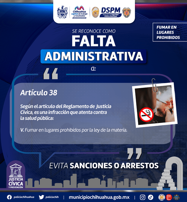 Miguel Ángel Villa, juez cívico en la Subdirección de Justicia Cívica y Prevención de la Dirección de Seguridad Pública Municipal (DSPM), señaló que el Artículo 38, fracción V, del Reglamento de Justicia Cívica considera que fumar en lugares prohibidos es una infracción que afecta la salud pública.