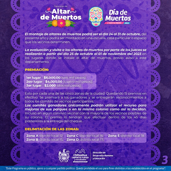 El alcalde Marco Bonilla considera que es fundamental promover actividades que fortalezcan las tradiciones arraigadas en México. Con el objetivo de reforzar nuestra identidad cultural y preservar nuestras costumbres, el Gobierno Municipal, a través de la Dirección de Desarrollo Humano y Educación, invita a los comités de vecinos a participar en un concurso de altares de muertos.