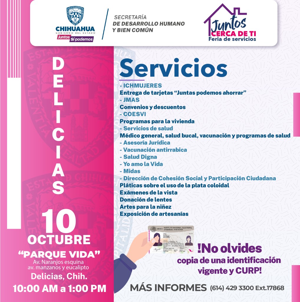 La Secretaría de Desarrollo Humano y Bien Común (SDHyBC) invita a los residentes de Delicias a asistir a la feria de servicios gratuitos llamada «Juntos Cerca de Ti». En este evento, podrán recibir diversas atenciones de parte de diferentes dependencias del Gobierno del Estado.