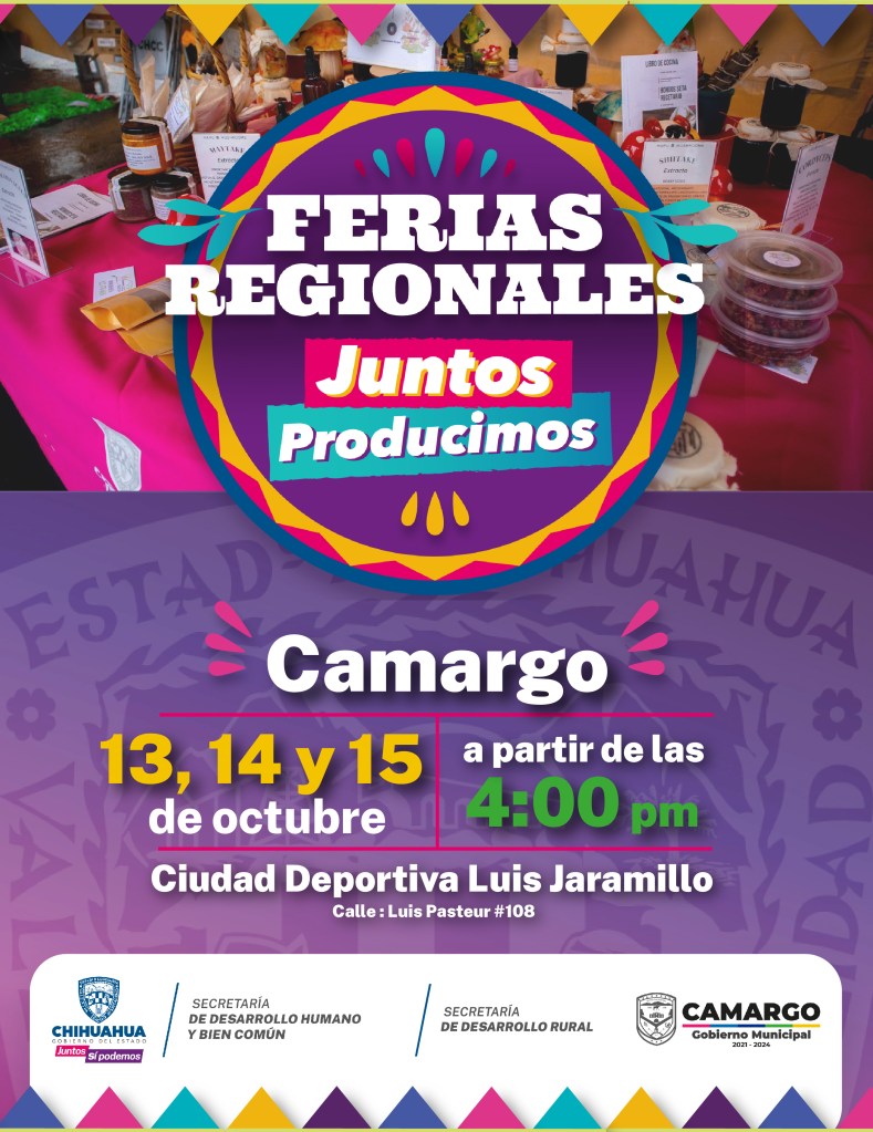 La Secretaría de Desarrollo Humano y Bien Común (SDHyBC) les extiende una invitación a todos los residentes de Camargo para que asistan a la «Feria Regional, Juntos Producimos» que se llevará a cabo del 13 al 15 de octubre. El propósito de este evento es promover y vender productos de Chihuahua.