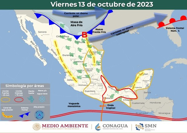 Este frente frío, combinado con la humedad que proviene del Océano Pacífico, la corriente en chorro, inestabilidad en las capas altas de la atmósfera y un canal de baja presión, también cambiará las condiciones del clima. Se anticipa un ambiente más fresco a templado por la mañana, y cálido a caluroso por la tarde, con temperaturas frías en las áreas montañosas.