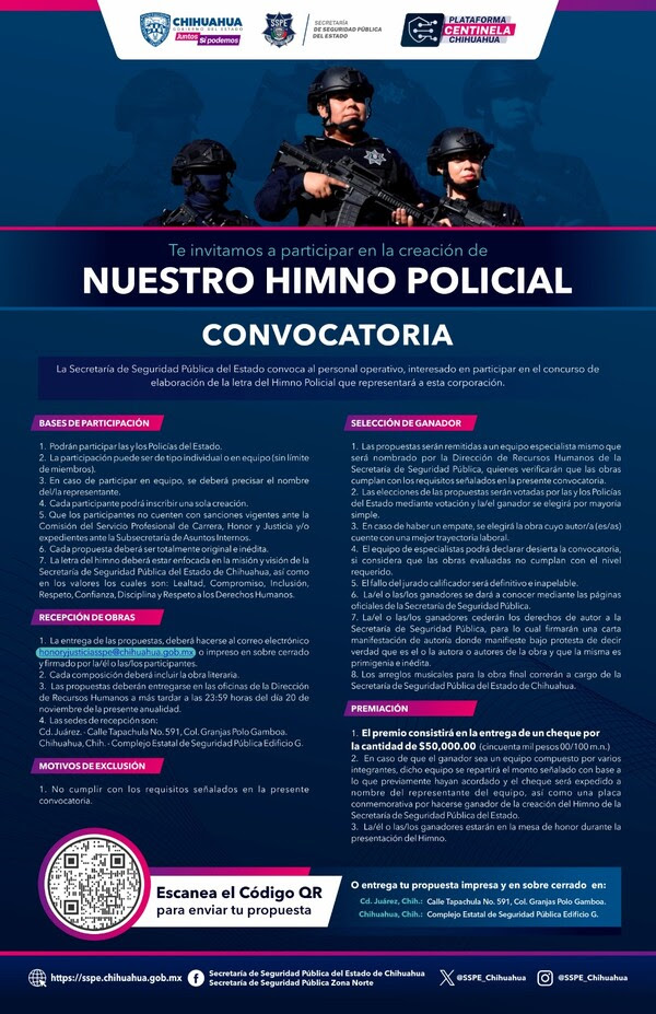 Con el propósito de promover un mayor sentido de pertenencia y civismo entre los agentes de la Secretaría de Seguridad Pública del Estado (SSPE), la Comisión del Servicio Profesional de Carrera, Honor y Justicia ha lanzado una invitación para crear el Himno Policial 2023.
