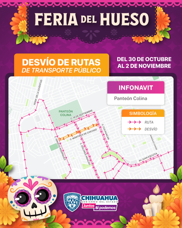 La Subsecretaría de Transporte del Gobierno del Estado ha anunciado que, desde el 30 de octubre hasta el 2 de noviembre, se implementarán cambios temporales en cuatro rutas del sistema de transporte público de pasajeros en la ciudad de Chihuahua. Esto se debe a la anticipada afluencia de personas que se espera visiten los cementerios locales para honrar a los difuntos y participar en la tradicional Feria del Hueso.