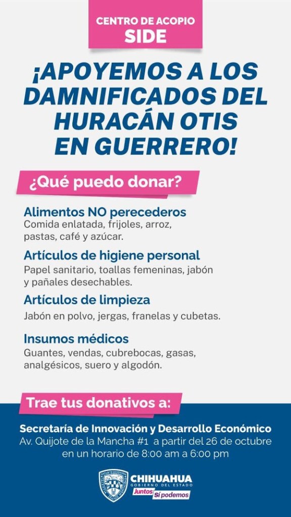 Dado el difícil momento que enfrenta el estado de Guerrero después del paso del huracán Otis hace unos días, el Gobierno del Estado de Chihuahua está invitando a la población a ayudar a las personas afectadas por este desastre natural. Han establecido un lugar de recolección de donaciones en las instalaciones de la Secretaría de Innovación y Desarrollo Económico (SIDE).