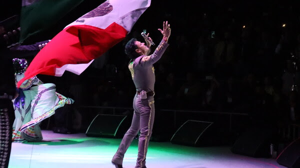 Al son de su famosa «Canción del Mariachi», el reconocido artista mexicano subió al escenario a las 8:30 de la noche, vestido con un traje de charro gris y una elegante capa roja, capturando la atención del público entre vítores y aplausos.