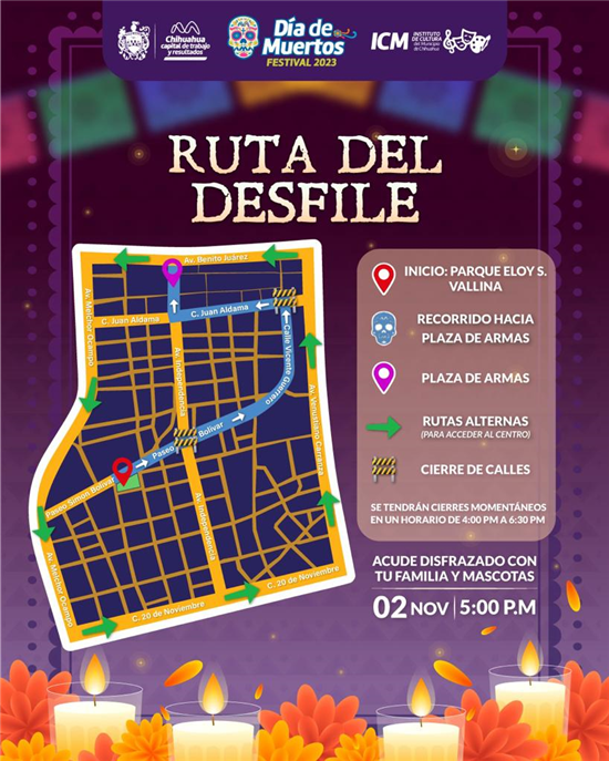 El Gobierno Municipal de Chihuahua quiere recordar a los ciudadanos que, debido al Festival del Día de Muertos que se llevará a cabo mañana a las 5:00 pm, habrá cierres temporales en algunas calles del Centro Histórico. Estos cierres serán entre las 4:00 y las 6:30 pm.