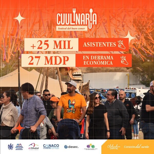 Siguiendo la visión del alcalde Marco Bonilla de convertir a Chihuahua Capital en un atractivo destino turístico y gastronómico a nivel global, el Gobierno Municipal llevó a cabo con gran éxito la quinta edición del festival «CUULINARIA» los días 4 y 5 de noviembre. Más de 25,000 residentes de Chihuahua participaron en el evento, generando aproximadamente 27 millones de pesos en actividad económica.