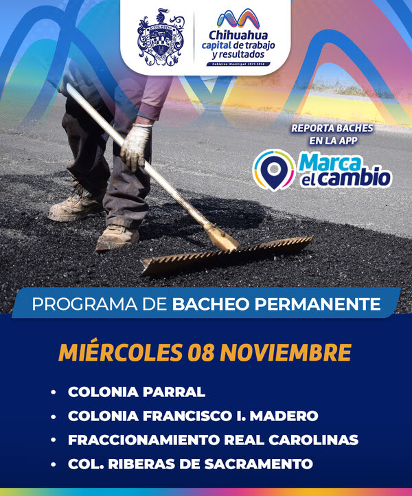 El Ayuntamiento quiere recordar a todos que el miércoles 08 de noviembre se llevarán a cabo reparaciones de baches en las colonias Parral, Francisco I. Madero, Riberas de Sacramento y el fraccionamiento Real Carolinas. Por lo tanto, se les pide a todos que tengan precaución al transitar por estas áreas mientras se realizan los trabajos.