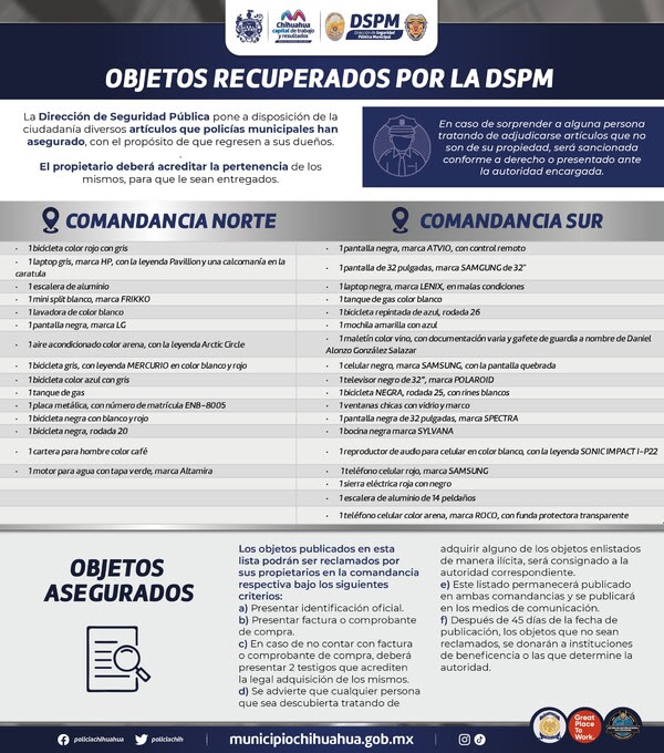 Las personas interesadas pueden acudir a las instalaciones en la avenida Homero número 500, en la colonia Revolución, o en las avenidas Pacheco y Pedro Meoqui, en la colonia Lealtad II, de lunes a viernes, de 09:00 a 15:00 horas, para revisar los listados y determinar si poseen algún artículo recuperado. En caso afirmativo, deben cumplir con ciertos requisitos, como presentar identificación oficial, factura o comprobante de compra, o en su defecto, dos testigos que acrediten la propiedad, así como un comprobante de domicilio.