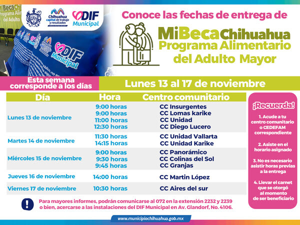 Debido al compromiso del alcalde Marco Bonilla con los adultos mayores de Chihuahua Capital y su bienestar, el Gobierno Municipal, a través del DIF, anuncia que del 13 al 17 de noviembre, las personas beneficiarias del Programa Alimentario del Adulto Mayor (PAAM) podrán recibir su apoyo alimentario en los centros comunitarios.