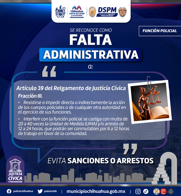 Con el propósito de mantener a la ciudadanía bien informada sobre las faltas administrativas comunes en el ámbito municipal y promover una convivencia social mejorada, la Dirección de Seguridad Pública Municipal (DSPM) hace un llamado a la comunidad para que evite cometer estas faltas, evitando así posibles multas o arrestos por parte de la autoridad.