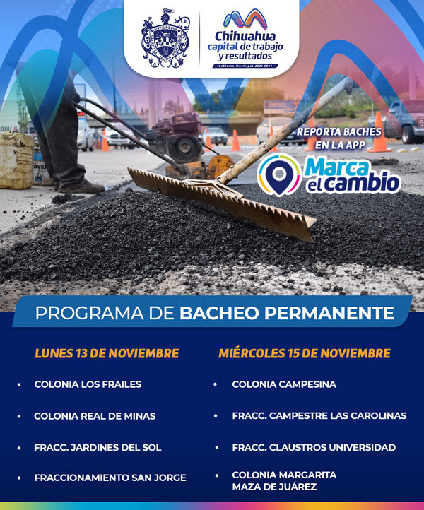El Ayuntamiento, dirigido por el alcalde Marco Bonilla, comunica que hoy, lunes 13 de noviembre, se llevará a cabo el trabajo de bacheo en las colonias Los Frailes, Real de Minas, así como en los fraccionamientos Jardines del Sol y San Jorge. Esta acción es posible gracias a los informes proporcionados por los residentes, y se hace un llamado a la precaución en las zonas de trabajo, solicitando respetar los señalamientos.