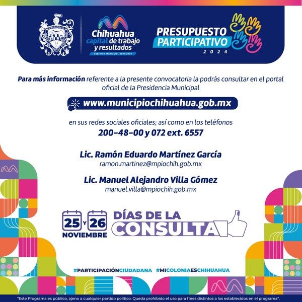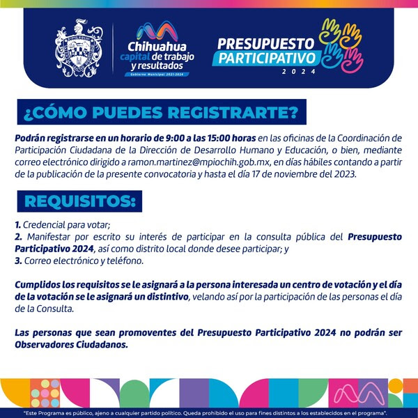 El registro se realiza de 9:00 a 15:00 horas en las oficinas de la Coordinación de Participación Ciudadana de la Dirección de Desarrollo Humano y Educación, o mediante correo electrónico a ramon.martinez@mpiochih.gob.mx, hasta el 17 de noviembre de 2023.