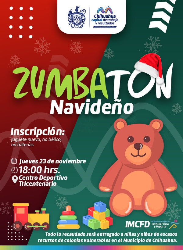 Con el propósito de brindar alegría a niños y niñas de familias con escasos recursos durante la temporada navideña, el Gobierno Municipal de Chihuahua, a través del Instituto Municipal de Cultura Física y Deporte (IMCFD), te invita a sumarte al «Zumbatón Navideño». La entrada para este evento especial consiste en la donación de un juguete.