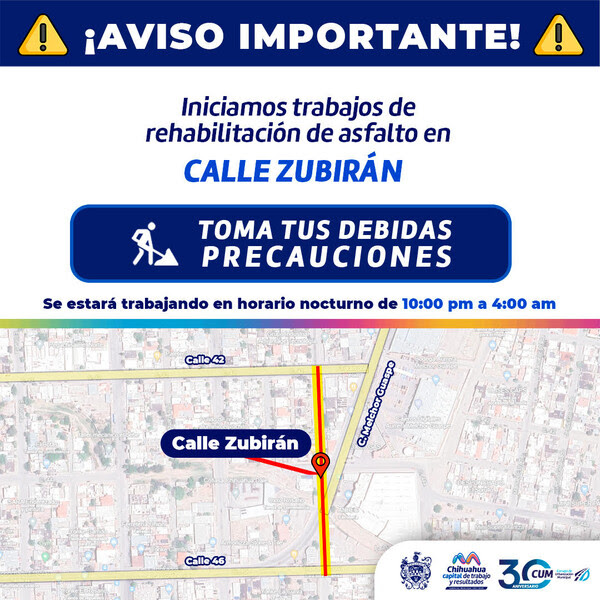 Con el objetivo de mejorar las condiciones de las calles para las familias de Chihuahua Capital, el Gobierno Municipal, liderado por el alcalde Marco Bonilla a través del Consejo de Urbanización Municipal (CUM), dará inicio a los trabajos nocturnos de recarpeteo con asfalto nuevo en la calle Zubirán, ubicada en la colonia Dale.