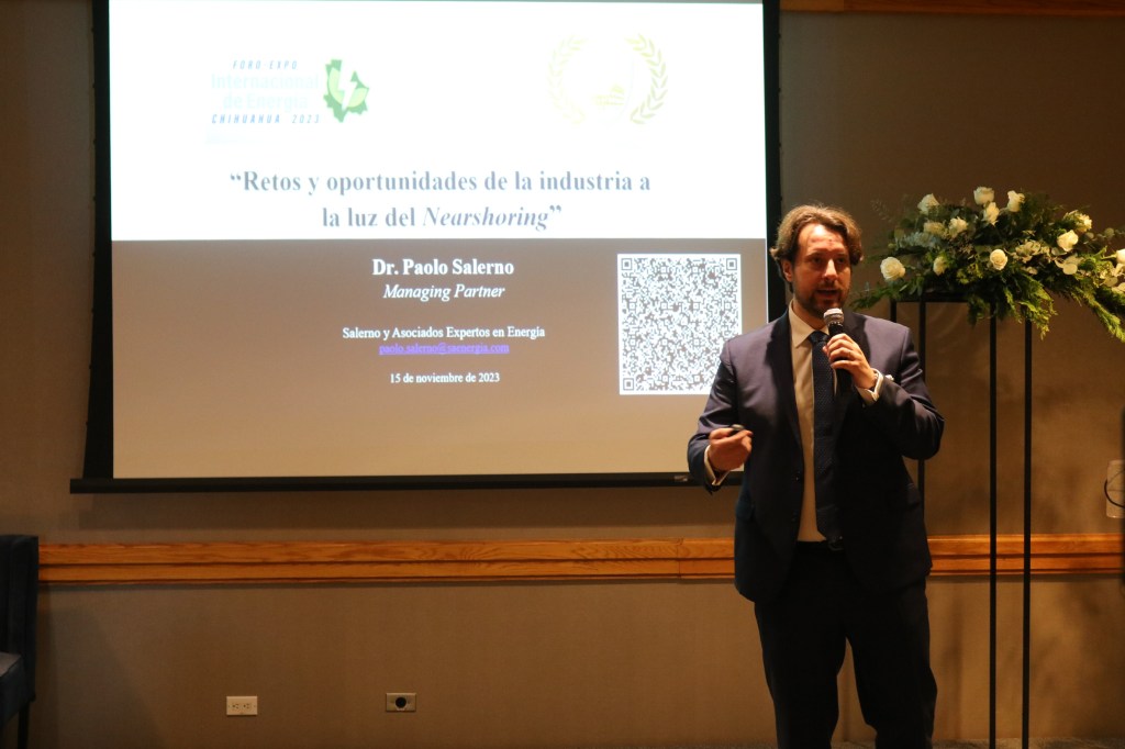 En el marco del segundo día del Foro-Expo Internacional de Energía Chihuahua 2023, Paolo Salerno, licenciado en Derecho por la Universidad Alma Mater Studiorum de Bologna (Italia) y reconocido abogado con experiencia en energía, compartió su perspectiva sobre la transición energética y la responsabilidad ambiental en la industria, especialmente en el contexto del nearshoring.