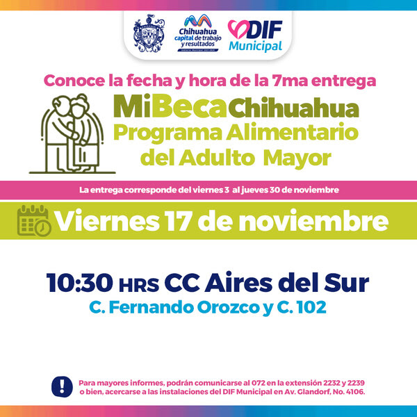 Con el compromiso del alcalde Marco Bonilla hacia los adultos mayores de Chihuahua Capital, con el objetivo de mejorar su calidad de vida, el Gobierno Municipal, a través del DIF, informa a la población que el próximo viernes 17 de noviembre, los beneficiarios del Programa Alimentario del Adulto Mayor (PAAM) pueden recoger su apoyo alimentario a las 10:30 am en el centro comunitario Aires del Sur.