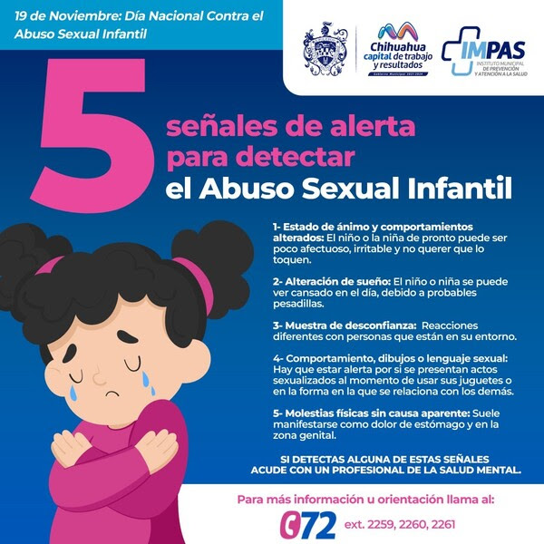 En conmemoración del «Día Nacional Contra el Abuso Sexual Infantil» el 19 de noviembre, el Gobierno Municipal, a través del Instituto Municipal de Prevención y Atención a la Salud (IMPAS), comparte señales de alerta que podrían indicar que niños y niñas han experimentado abuso sexual.
