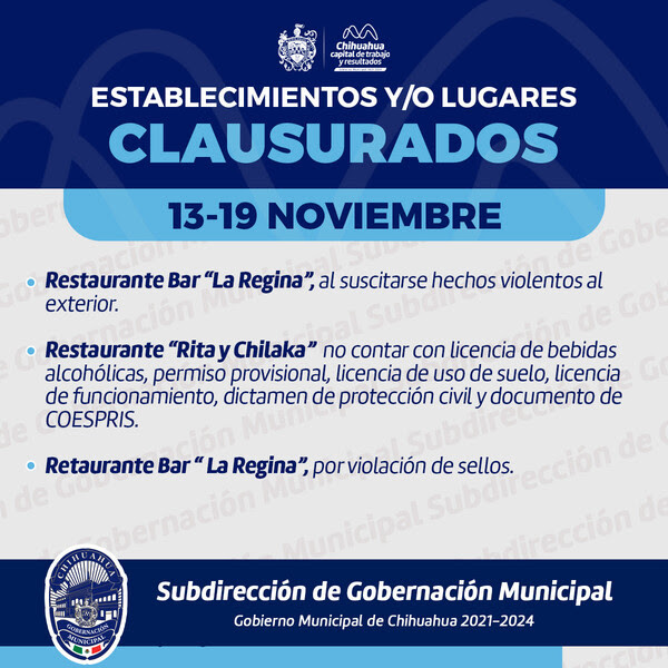 - El jueves 16 de noviembre, se clausuró el restaurante «Rita y Chilaka» por carecer de licencia de bebidas alcohólicas, permiso provisional, licencia de uso de suelo, licencia de funcionamiento, dictamen de protección civil y documento de COESPRIS.
