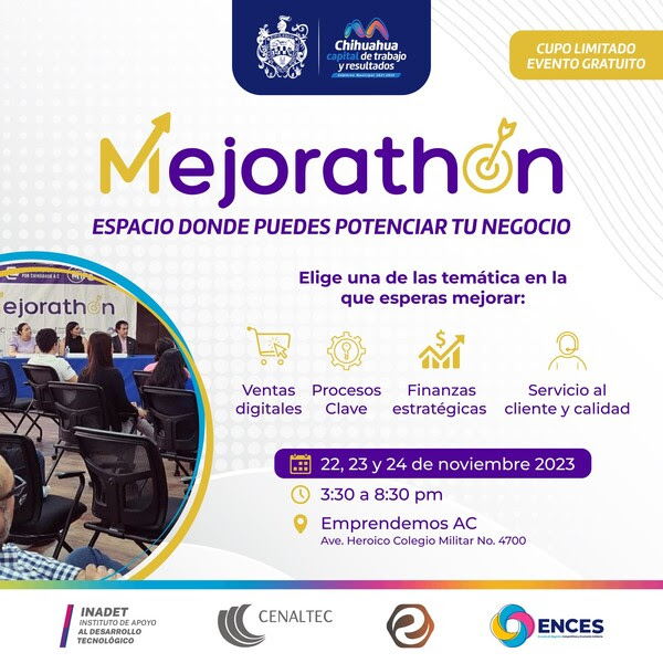 El Mejorathón se llevará a cabo de manera presencial del 22 al 24 de noviembre, de 15:30 a 20:30 horas, con un cupo limitado de 15 microempresas que recibirán asesorías de forma gratuita. Para registrarse, es necesario cumplir con requisitos como ser de la ciudad de Chihuahua, tener más de 6 meses de operación, y contar con documentos como plan de negocios, planeación estratégica, modelo de negocios, costos y ventas por escrito, análisis financiero, corrida financiera o flujo de efectivo, independientemente de su antigüedad o actualización.