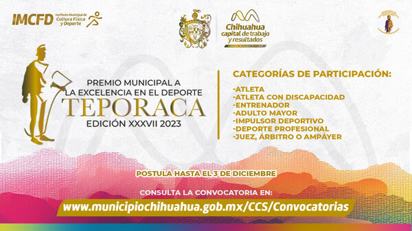 El Gobierno Municipal de Chihuahua, a través del Instituto Municipal de Cultura Física y Deporte (IMCFD), sigue promoviendo el Premio Municipal a la Excelencia en el Deporte ‘Teporaca’. Se ha colaborado con representantes de comités deportivos municipales, entrenadores y promotores chihuahuenses en la difusión de esta convocatoria.