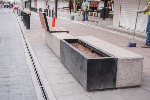 En la actualidad, se está llevando a cabo el trabajo de paisajismo en el área. Se están plantando árboles a lo largo de la calle Libertad, entre la avenida Ocampo y la calle Cuarta, junto con jardineras que contienen plantas ornamentales. La colocación de pisos de concreto estampado y adoquines ya ha sido completada.