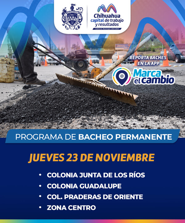 El día 23 de noviembre, el Gobierno Municipal realizará labores de bacheo en las colonias Junta de Los Ríos, Guadalupe, Praderas de Oriente y en la Zona Centro. El alcalde Marco Bonilla reafirma su compromiso de mejorar las condiciones de las calles y avenidas para los residentes de Chihuahua a través del programa Permanente de Bacheo, dirigido por la Dirección de Obras Públicas.