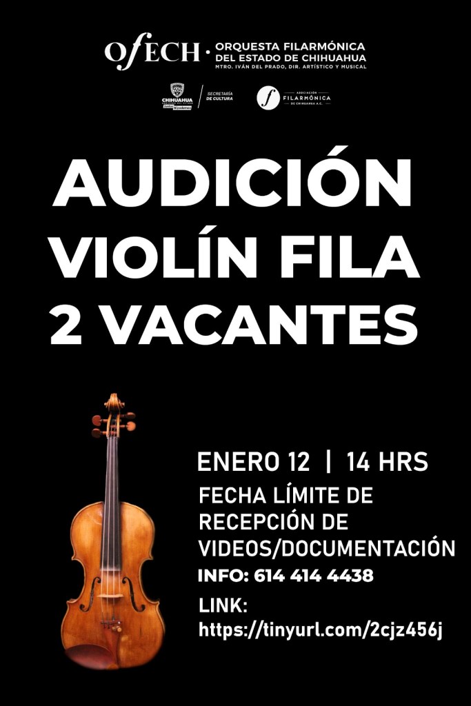La Secretaría de Cultura hace un llamado a músicos experimentados en violín para sumarse a la Orquesta Filarmónica del Estado de Chihuahua (OFECh), que tiene dos vacantes disponibles en la sección «Violín Fila». La fecha límite para registrarse es el 12 de enero de 2024.