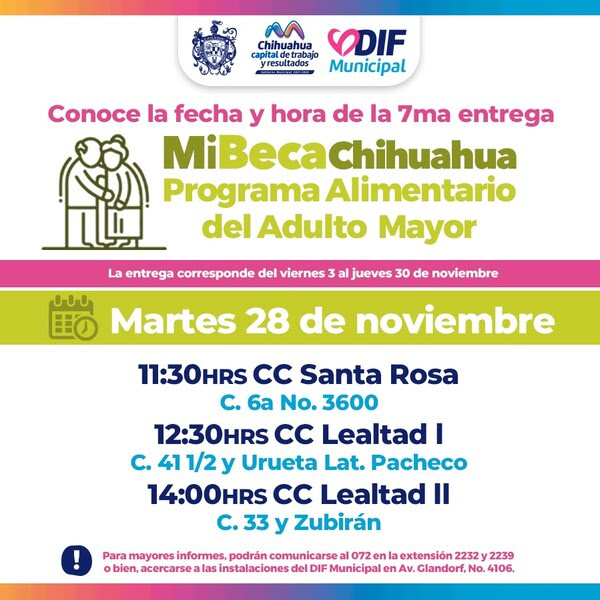 En cumplimiento del compromiso del alcalde Marco Bonilla con los adultos mayores de Chihuahua Capital para mejorar su calidad de vida, el Gobierno Municipal, a través del DIF Municipal, comunica a la ciudadanía que el martes 28 de noviembre, los beneficiarios del Programa Alimentario del Adulto Mayor (PAAM) pueden recoger su apoyo alimentario en los centros comunitarios en los siguientes horarios: