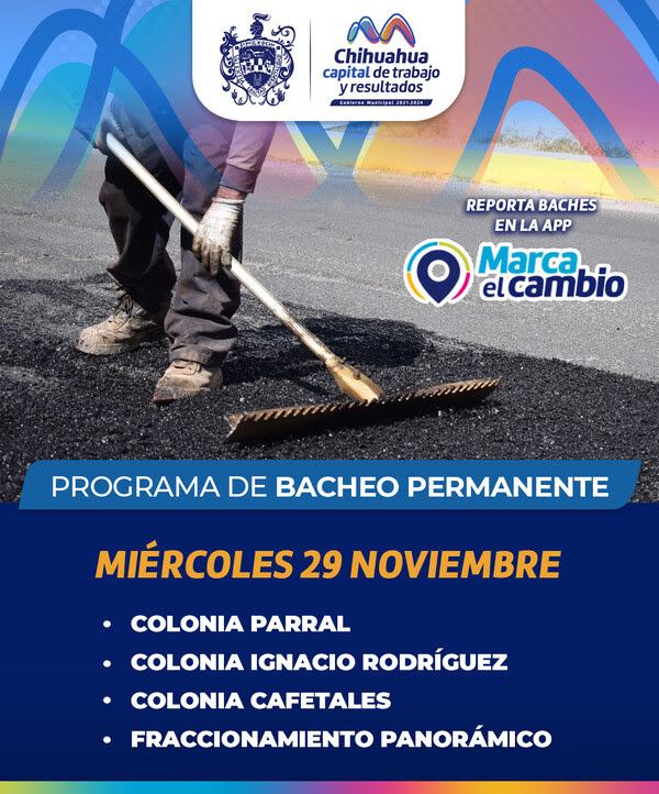 Con el fin de garantizar una circulación segura y eficiente, el Gobierno Municipal encabezado por el alcalde Marco Bonilla llevará a cabo labores de bacheo este miércoles 29 de noviembre en las colonias Parral, Ignacio Rodríguez, Cafetales y en el fraccionamiento Panorámico.