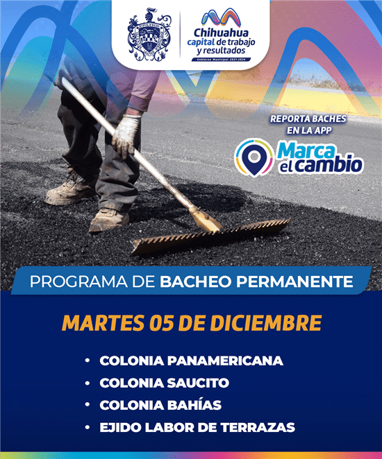 Este martes 5 de diciembre, se atenderán los informes correspondientes a las colonias Panamericana, Bahías, Saucito y al ejido Labor de Terrazas. Se insta a los residentes a circular con precaución en las áreas de trabajo.