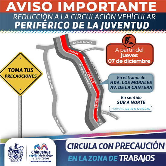 Debido a las recientes bajas temperaturas en la ciudad, la Dirección de Obras Públicas del Gobierno Municipal informa que los trabajos de rehabilitación en la superficie de rodamiento del periférico de la Juventud, que originalmente se realizaban durante la noche en dirección de sur a norte desde la Hacienda de los Morales hasta La Cantera, ahora se llevarán a cabo durante la mañana debido al uso de mezcla asfáltica caliente.