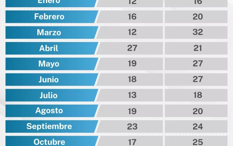 Durante el análisis estadístico, se observó que los meses con mayor número de detenciones fueron noviembre con 29, mayo con 27 y junio con 27.