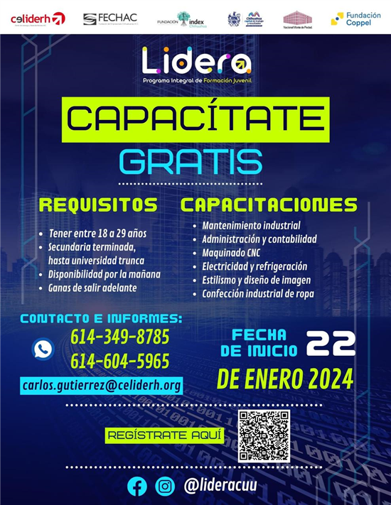 El programa inicia el 22 de enero de 2024. Para obtener más información, se pueden comunicar al 614-349-87-85 o al 614-604-59-65. Además, se ofrece la opción de contactar a través del correo electrónico carlos.gutierrez@celiderh.org.