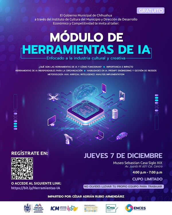 La Subdirección de Gestión y Proyectos del Instituto de Cultura del Municipio (ICM) llevó a cabo el primer grupo del Módulo I de Herramientas de Inteligencia Artificial el jueves 7 de diciembre en la Sala Guirnalda del Museo Sebastian Casa Siglo XIX. Este evento forma parte de las iniciativas destinadas a profesionalizar a los artistas y creadores de Chihuahua Capital.