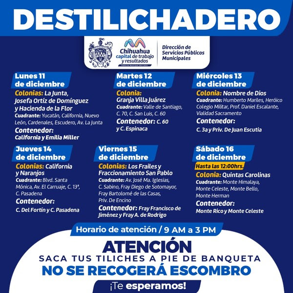 El Ayuntamiento de Chihuahua, liderado por el alcalde Marco Bonilla y a través de la Dirección de Servicios Públicos Municipales, comunica a la comunidad el itinerario del programa Destilichadero, programado del 11 al 16 de diciembre en 10 colonias de Chihuahua Capital.
